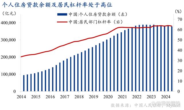 房產在居民資產中占比較高,約占家庭總資產的三分之二,房價下行必然導致居民資產縮水,然而房貸償還壓力依然較大。截至2024年二季度,居民個人住房貸款余額仍有37.8萬億元,杠桿率徘徊在63.5%的高位。居民收入優先償債,可支配收入減少,消費自然下滑。
