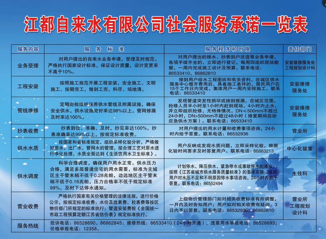 江都自來水有限公司社會服務承諾一覽表