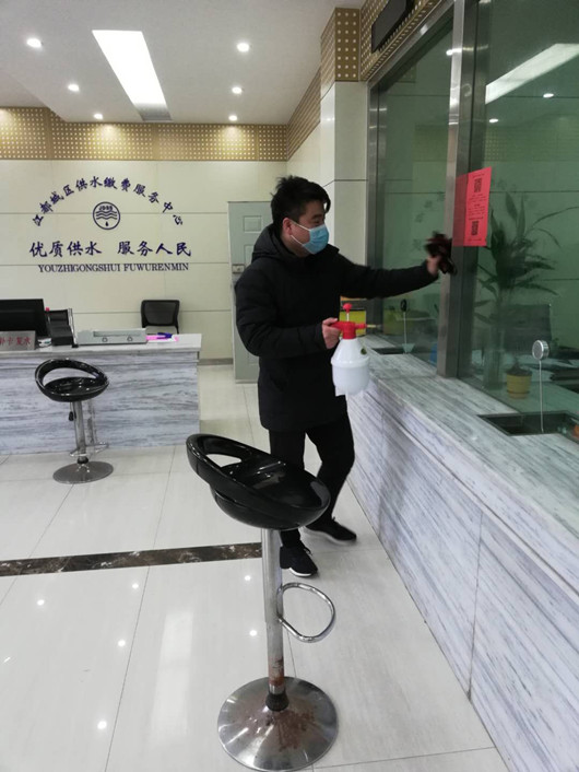 “在如此特殊時期,一線干部職工為保障群眾的供水安全,每天堅持在供水一線,我很感動,希望盡自己的微薄之力為一線干部職工的安全提供保障。”王俊說道。據了解,在春節值班抗擊疫情初期,公司沒有足夠的口罩,王俊就從家中拿出自備中的絕大部分口罩分給營業所服務大廳的值守人員和面向基層一線的服務同志。除此之外,王俊還自帶消毒液,每天堅持帶頭定時定點對營業大廳進行消毒,為營業所工作人員和前來辦理相關應急業務的居民提供安全放心的服務環境。
