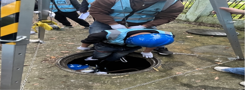 隨著演練正式開始,演練人員在閥門井口發現有人違規操作,入井倒地。指揮組接到匯報,命令啟動有限空間應急搶修預案,并趕往現場。同時保障組攜帶鼓風機、安全繩、呼吸器等安全設施進入現場。站長到達閥門井后,使用空氣監測儀,并不間斷匯報檢測數據。搶修組進入現場后,穿戴防護用具。