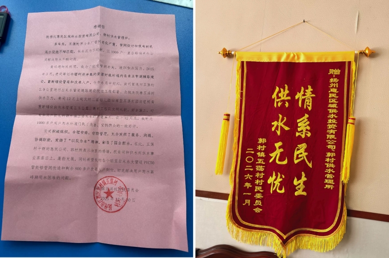 民有所呼,必有所應(yīng)。惠民區(qū)域供水公司郭村供水管理所始終將群眾“急、難、愁、盼”放在首位,主動(dòng)扛起供水保障政治責(zé)任與民生擔(dān)當(dāng),以實(shí)干實(shí)效回應(yīng)群眾期盼。2025年3月,公司統(tǒng)籌規(guī)劃、集約資源,啟動(dòng)五蕩村自來(lái)水管道隨路建設(shè)工程,重新鋪設(shè)管道和改表入戶。6月中旬起,惠民區(qū)域供水公司率先完成村內(nèi)2.9公里自來(lái)水主管道改造;12月上旬,為進(jìn)一步提升供水壓力,惠民區(qū)域供水公司又對(duì)二姜幼兒園向南至團(tuán)結(jié)組橋南的2.5公里自來(lái)水主管道進(jìn)行重新鋪設(shè)。截至2025年12月底,五蕩村近1000戶村民的用水環(huán)境得到顯著改善,“用水難”問(wèn)題得到有效緩解。五蕩村在感謝信中表示,惠民區(qū)域供水公司郭村供水管理所積極組織、合理安排、創(chuàng)新管理,充分發(fā)揮服務(wù)、溝通、協(xié)調(diào)職能,發(fā)揚(yáng)“以民為本”精神,彰顯了國(guó)企擔(dān)當(dāng)。同時(shí),村民也熱切期盼,后續(xù)各組PVC50自來(lái)水支管改造及剩余800余戶改表入戶工作能夠加快推進(jìn),徹底破解高峰期用水瓶頸,真正實(shí)現(xiàn)全域供水全覆蓋、全保障、全無(wú)憂。
